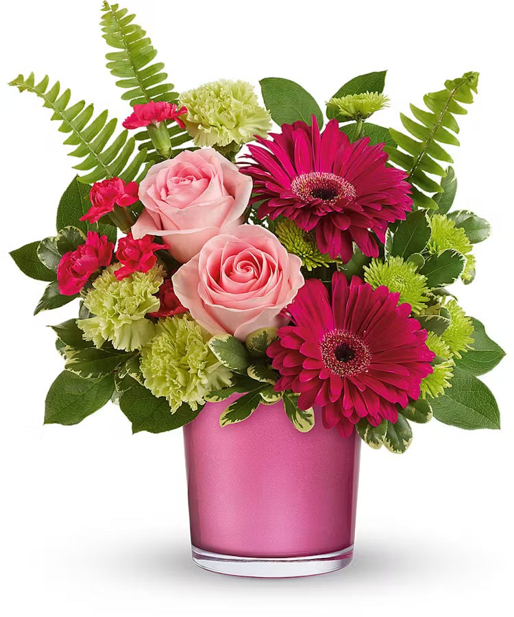 Hot pink cylinder vase with red gerber daisies, pink roses, green carnations, red mini carnations and green buttons.